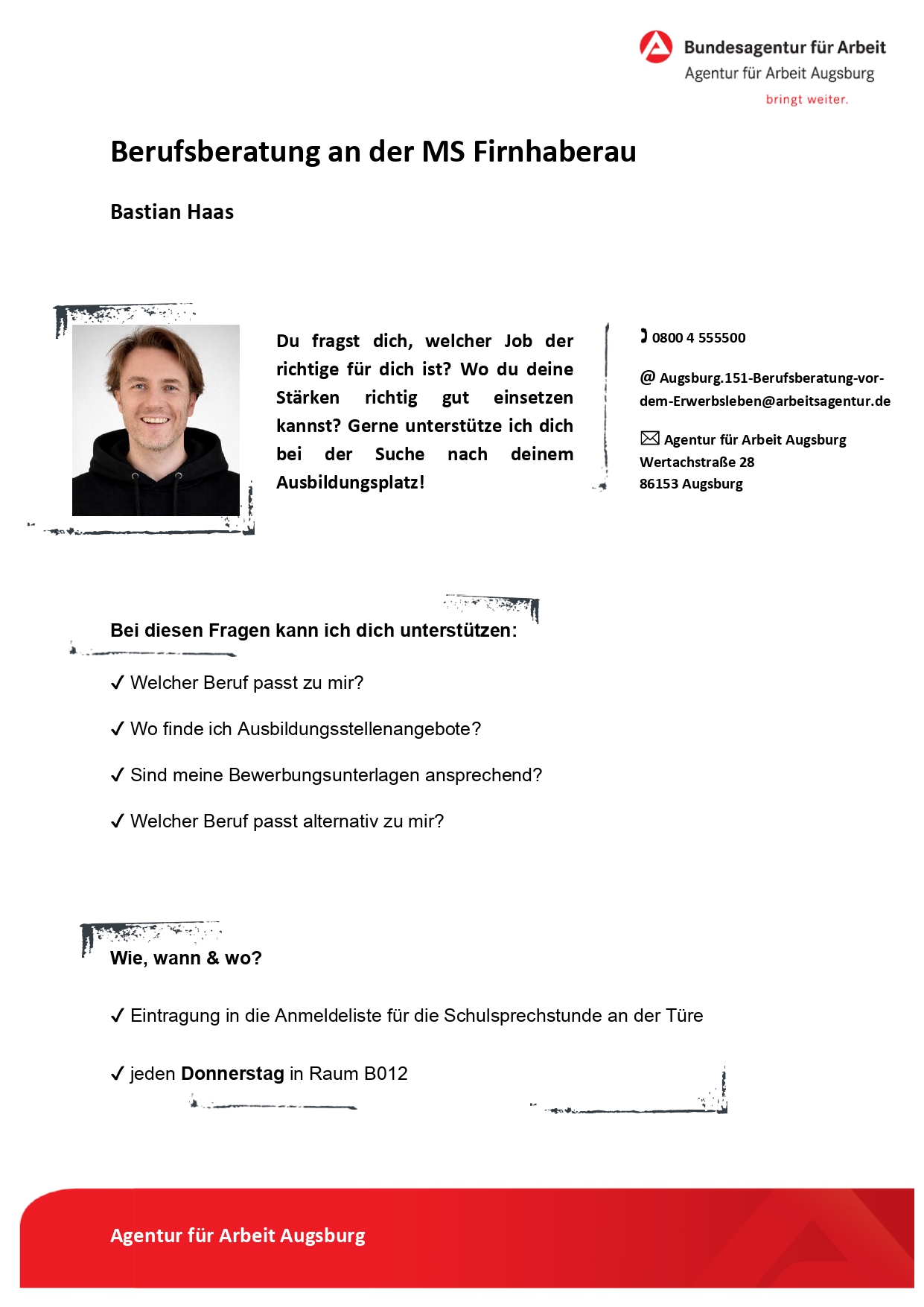 Ich bin für die Berufsorientierung in den 8. Klassen zuständig und jeden Mittwoch von 8:30 Uhr bis 12:30 Uhr im Haus. Bei Fragen zu Bewerbung oder Ausbildung könnt ihr gerne vorbei kommen, mich anrufen oder mir eine Mail schreiben.